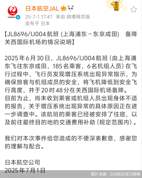 根据7月1日下午日本航空发布的情况说明,在JL8696/IJ004航班飞行过程中,飞行员发现增压系统出现异常指示,为确保旅客与机组成员的安全,将飞机降低到安全飞行高度并于20时48分在关西国际机场备降。