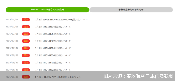 目前,春秋航空日本官网发布最新公告,6月30日、7月1日和7月2日,春秋航空日本多批次航班取消。其中包括7月1日的东京(成田)—上海(浦东)IJ001次、IJ002次航班,7月1日的东京(成田)—广岛IJ621次、IJ622次航班,7月1日的东京(成田)—宁波IJ101次、IJ102次航班等8趟往返航班。